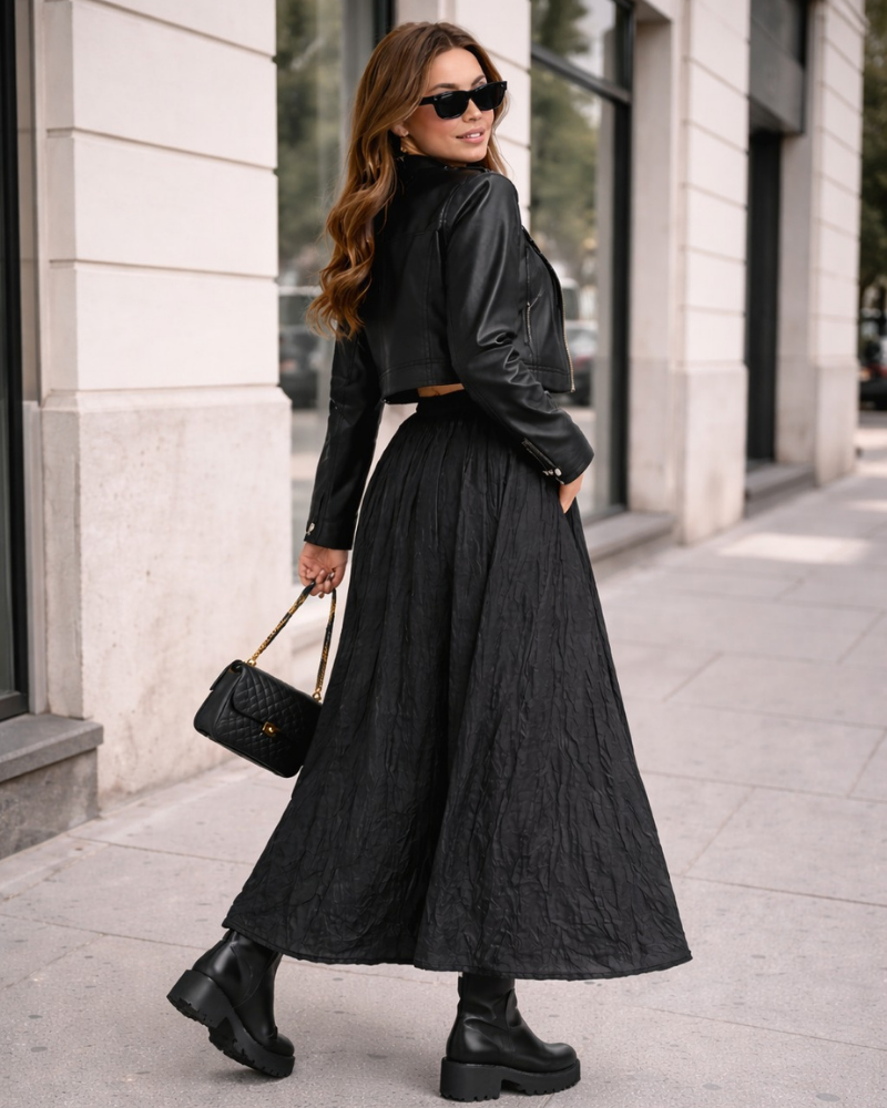 •  Uzun kırışık(kraş) etek, rahat kesimiyle günlük kullanım için idealdir.